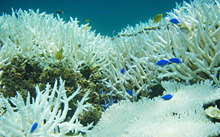 白化現象とは、高い海水温がおよそ2週間ほど続くと、サンゴの体内に共生する褐虫藻が弱り、まるで骨がむき出しになったように白くなってしまう現象です。